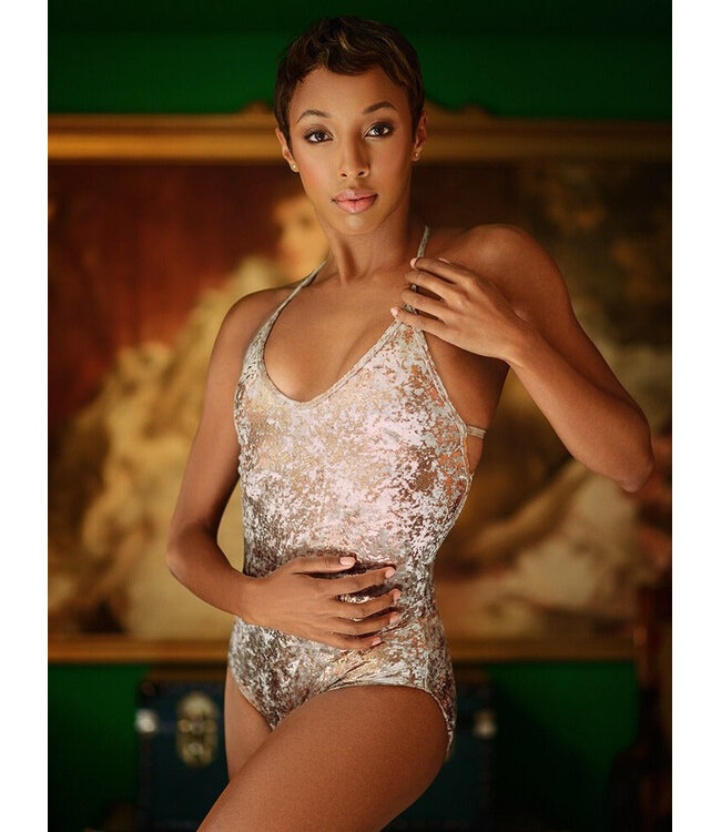 Prepare to dazzle! The striking Iris leotard is now available in our Foiled Topaz Velvet for some Holiday shine. With intricate back strap details and a deep V neckline, this leotard will surely emphasize your grand entrance this season. Soften the look with the Peacock Skirt or Tulip Skirt in Topaz Mesh, also available as part of our Ready to Wear line.